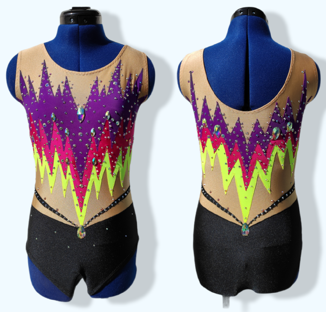 Dieses Kostüm ist aus bielastischem Lycra gefertigt und mit mehr als 720 Strasssteinen und 27 Aufnähsteinen (Acryl) besetzt. Der Anzug ist ein Einzelstück und handgenäht.