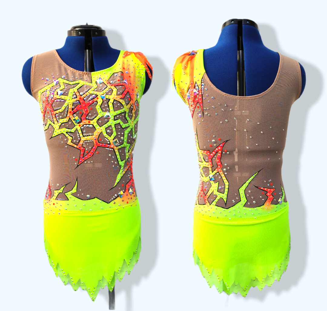 Dieses Kleid ist aus bielastischem Lycra und Netzstoff gefertigt und mit über 1110 Strasssteinen und 25 Aufnähsteinen (Glas) besetzt. Das Kostüm ist ein Einzelstück und handgenäht.