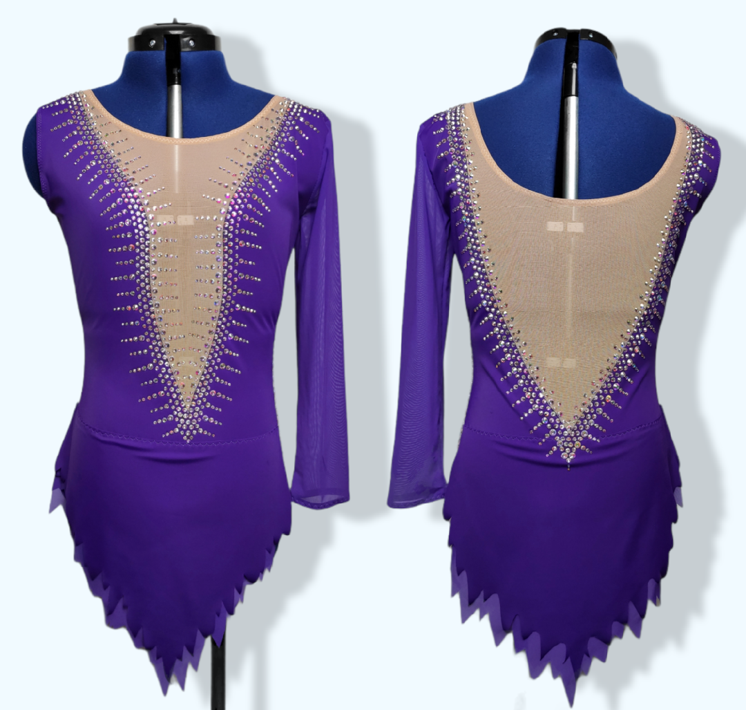 Dieses Kleid ist aus bielastischem Lycra und Netzstoff gefertigt. Es wurde mit über 1820 Strasssteinen besetzt. Es hat einen hautfarbenen Einsatz an einem Hosenbein. Dieses Kostüm ist ein Einzelstück und handgenäht.