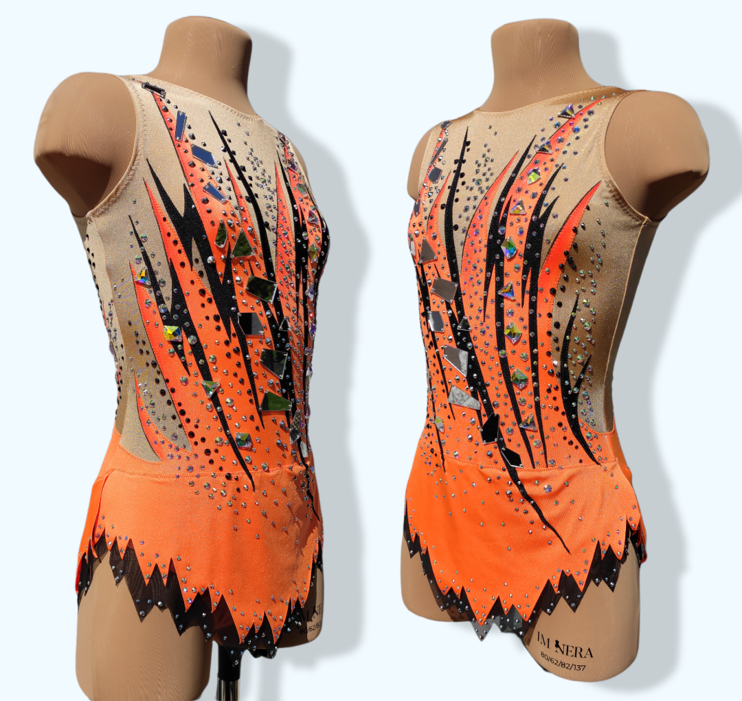 Dieses Kleid ist aus bielastischem Lycra gefertigt. Es wurde mit über 1240 Strasssteinen und 38 Aufnähsteinen und Spiegelsplittern besetzt. Dieses Kostüm ist ein Einzelstück und handgenäht.