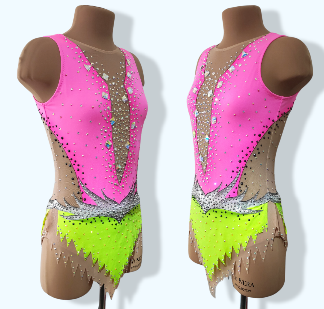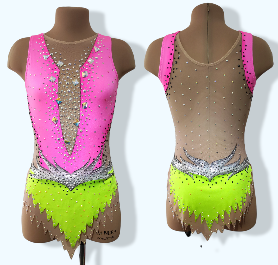 Dieses Kostüm ist aus bielastischem Lycra und Netzstoff gefertigt und mit über 1430 Strasssteinen und 12 Aufnähsteinen besetzt. Das Kostüm hat einen doppellagigen Rock, ist ein Einzelstück und hangenäht.