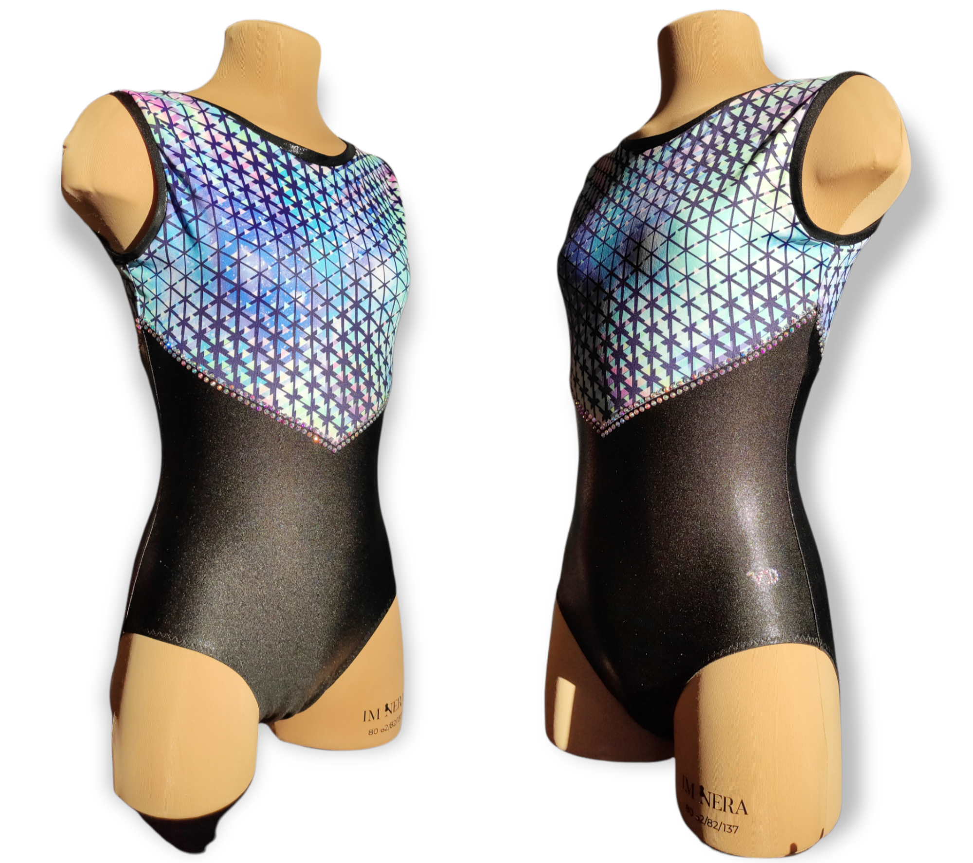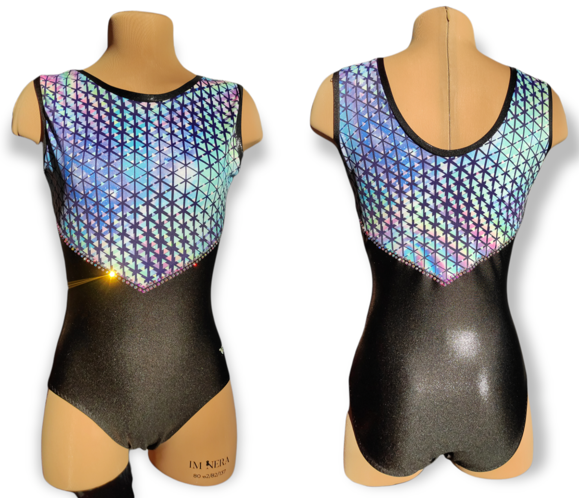 Dieser Turnanzug ist aus Lycra gefertigt der in alle Richtungen dehnbar ist. Der bemusterte Stoff ist bedruckter Lycra-Stoff, außerdem ist ein Zwickel eingenäht.