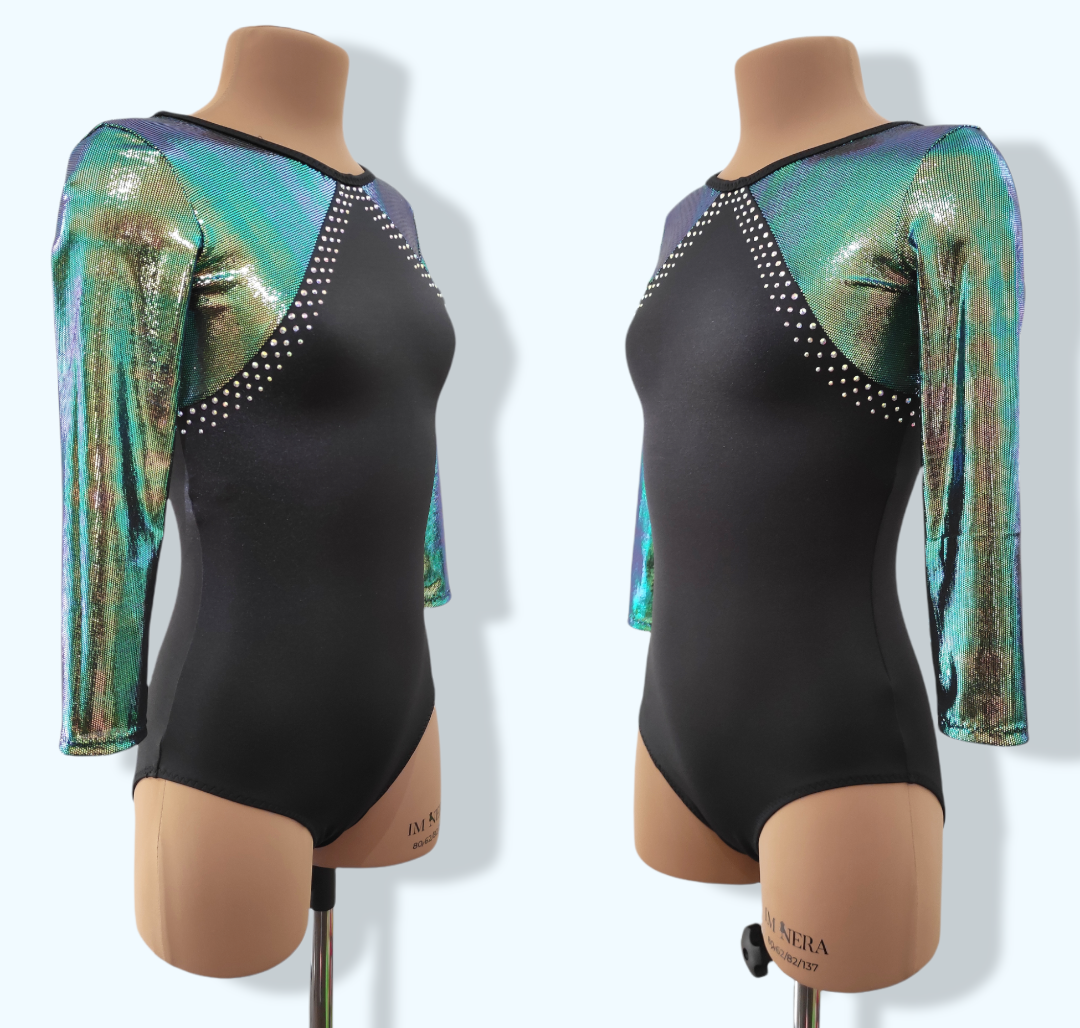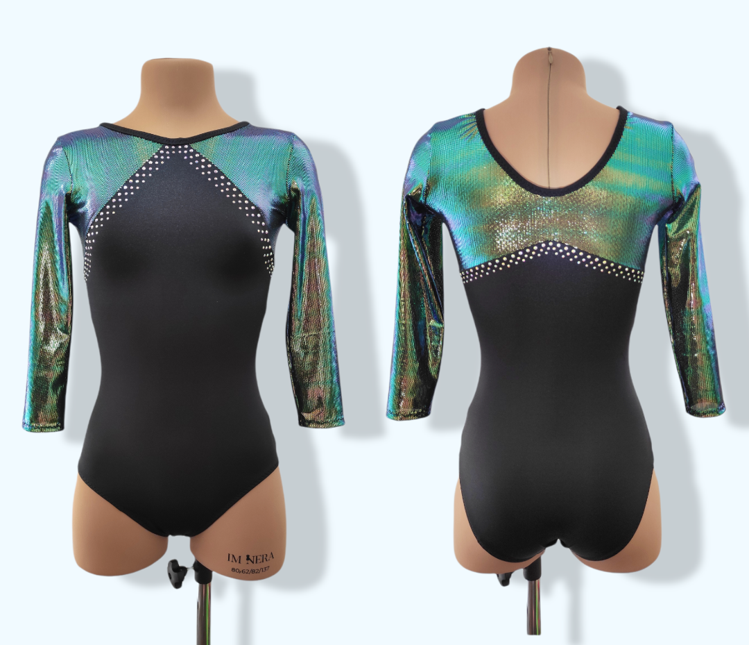Dieser Turnanzug ist aus Lycra gefertigt der in alle Richtungen dehnbar ist. Der glänzende Stoff ist ein Netz mit irisierenden Pailletten. Die Ärmel sind 3/4 lang, außerdem ist ein Zwickel eingenäht.